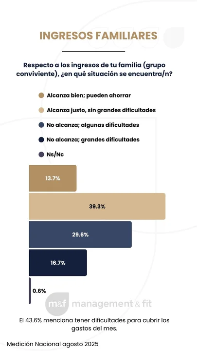 Según supo Noticias Argentinas, esta situación se corresponde directamente con los datos sobre ingresos familiares del mismo estudio, donde un 46,3% de los hogares reporta que sus ingresos no son suficientes para cubrir los gastos del mes (29,6% con «algunas dificultades» y 16,7% con «grandes dificultades»).