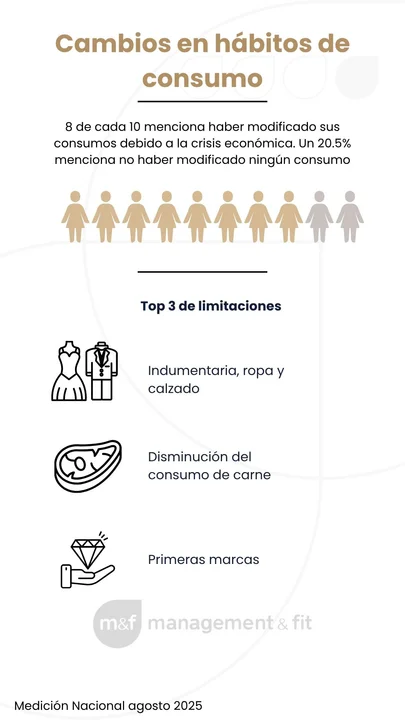 Un nuevo sondeo nacional de la consultora Management & Fit expone el profundo impacto de la crisis económica en los hogares argentinos: 8 de cada 10 personas aseguran haber modificado sus hábitos de consumo para poder afrontar la situación. Los principales recortes se dan en indumentaria y calzado, la disminución del consumo de carne y el reemplazo de primeras marcas por alternativas más económicas.