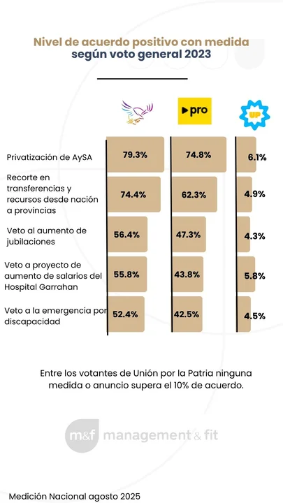 División por voto: Se observa una fuerte grieta ideológica. Mientras los votantes de La Libertad Avanza y el PRO apoyan mayoritariamente las medidas, ninguna de ellas supera el 10% de acuerdo entre los votantes de Unión por la Patria.