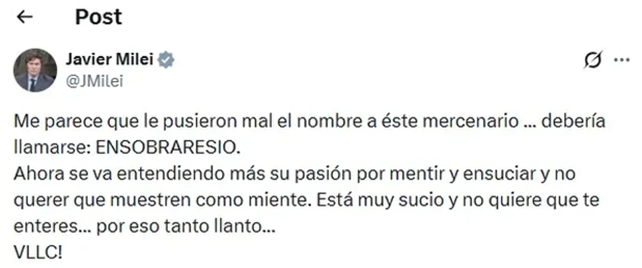 En su réplica, Milei no solo validó las críticas previas, sino que profundizó la descalificación personal hacia el conductor. «Me parece que le pusieron mal el nombre a este mercenario… debería llamarse: ENSOBRARESIO», disparó el mandatario.