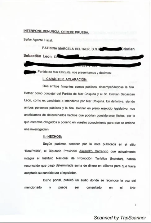 Según supo Noticias Argentinas a partir de una publicación del sitio del periodista Ricardo Benedetti, la denuncia fue formalizada en la fiscalía por el excandidato a intendente de Mar Chiquita, Cristian León, y la concejal Patricia Heltner. Afirman tener «testimonios, documentos y audios» que prueban la maniobra.