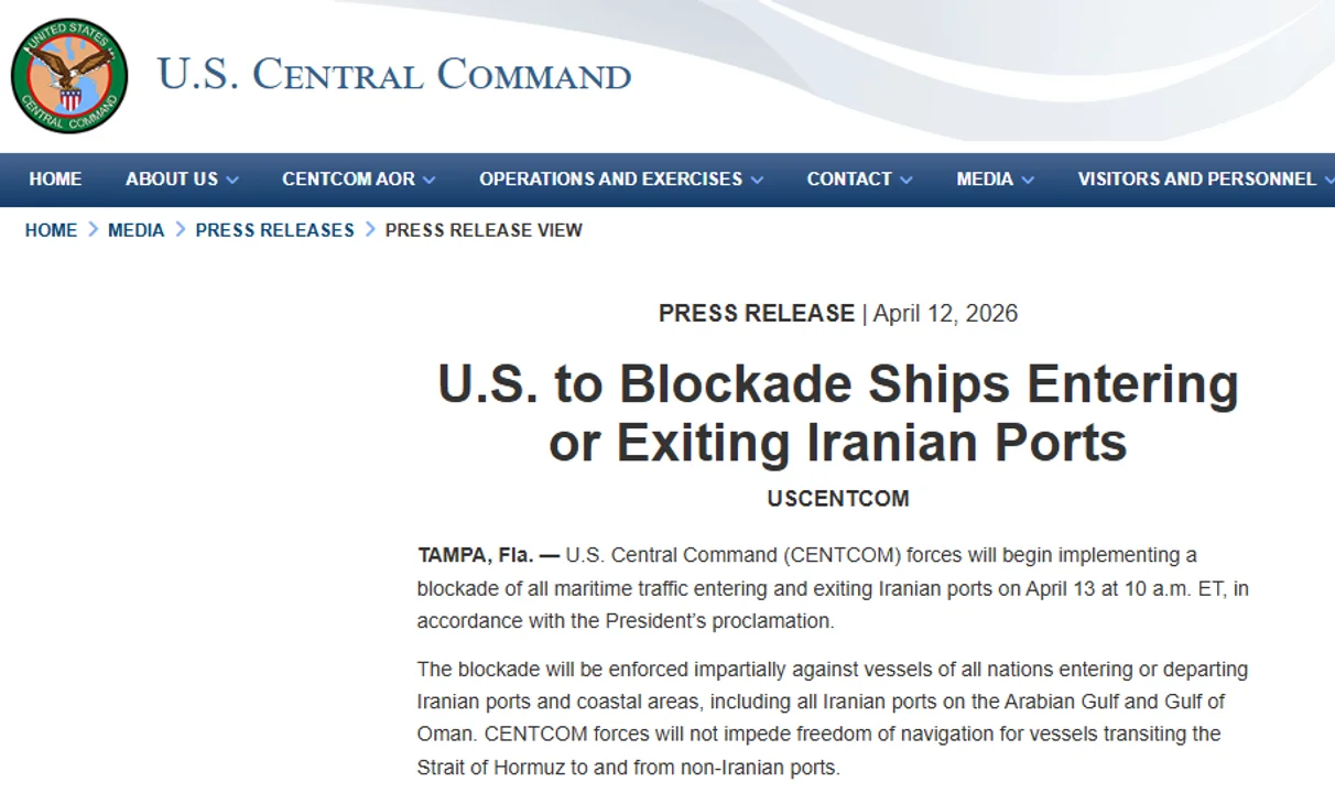 Las fuerzas del Comando Central de Estados Unidos (CENTCOM) comenzarán a implementar un bloqueo de todo el tráfico marítimo que entra y sale de los puertos iraníes el 13 de abril a las 10 AM, hora del este en el país del norte (las 11 AM de la Argentina), de acuerdo con la proclamación del presidente Donald Trump.