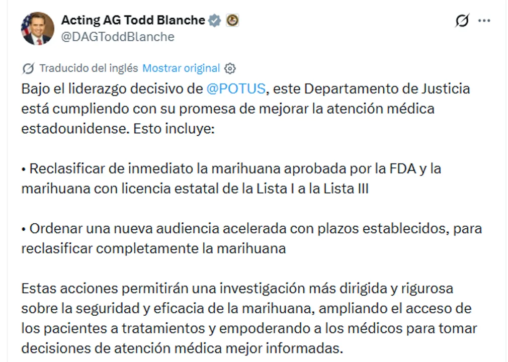El Gobierno de Estados Unidos reclasificó la marihuana medicinal de la Lista I a la Lista III, es decir, como una droga de menor riesgo, para posibilitar una investigación “más dirigida y rigurosa sobre la seguridad y eficacia”.