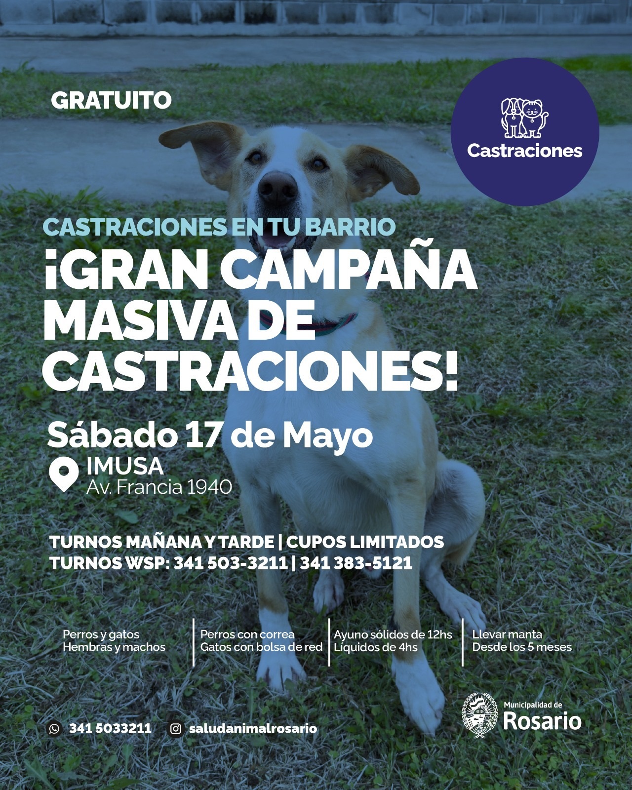La Municipalidad de Rosario, a través del área de Salud Animal, continúa adelante con su campaña de castración gratuita y masiva. En este marco, el sábado 17 de mayo tendrá lugar una nueva jornada en la sede del Instituto Municipal de Salud Animal (Imusa), ubicado en avenida Francia 1940. La jornada está destinada a perros y gatos, tanto machos como hembras, a partir de los 5 meses de edad.