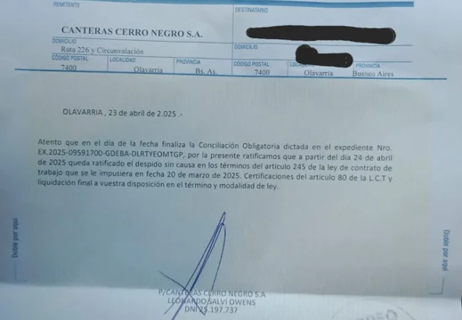 “Atento que en el día de la fecha finaliza la conciliación obligatoria, por la presente ratificamos que a partir del 24 de abril de 2025 queda ratificado el despido sin causa”, indicó Cerro Negro en los telegramas que envió al 25% de sus 400 trabajadores.