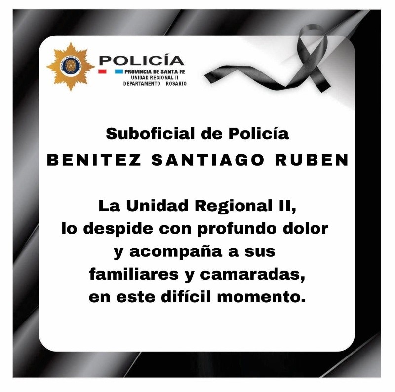 El agente de la Brigada Motorizada Santiago Rubén Benítez, de apenas 21 años, murió este sábado por la noche luego de permanecer internado en estado crítico en el Hospital de Emergencias Clemente Álvarez (Heca). El joven oficial había sufrido graves heridas tras un siniestro vial ocurrido en la zona de avenida Belgrano y San Martín, en cercanías del Monumento a la Bandera.