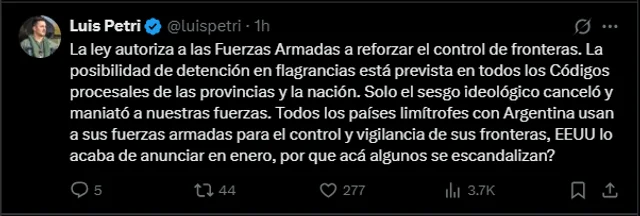 El Gobierno Nacional autorizó a los militares a detener civiles en forma transitoria que hayan cometido delitos de flagrancia, según confirmó Luis Petri. “Sí, es una medida controversial para todos los que defienden narcos, terroristas y violentos delincuentes. Elijan de que lado van a estar”, expresó en su cuenta de X.