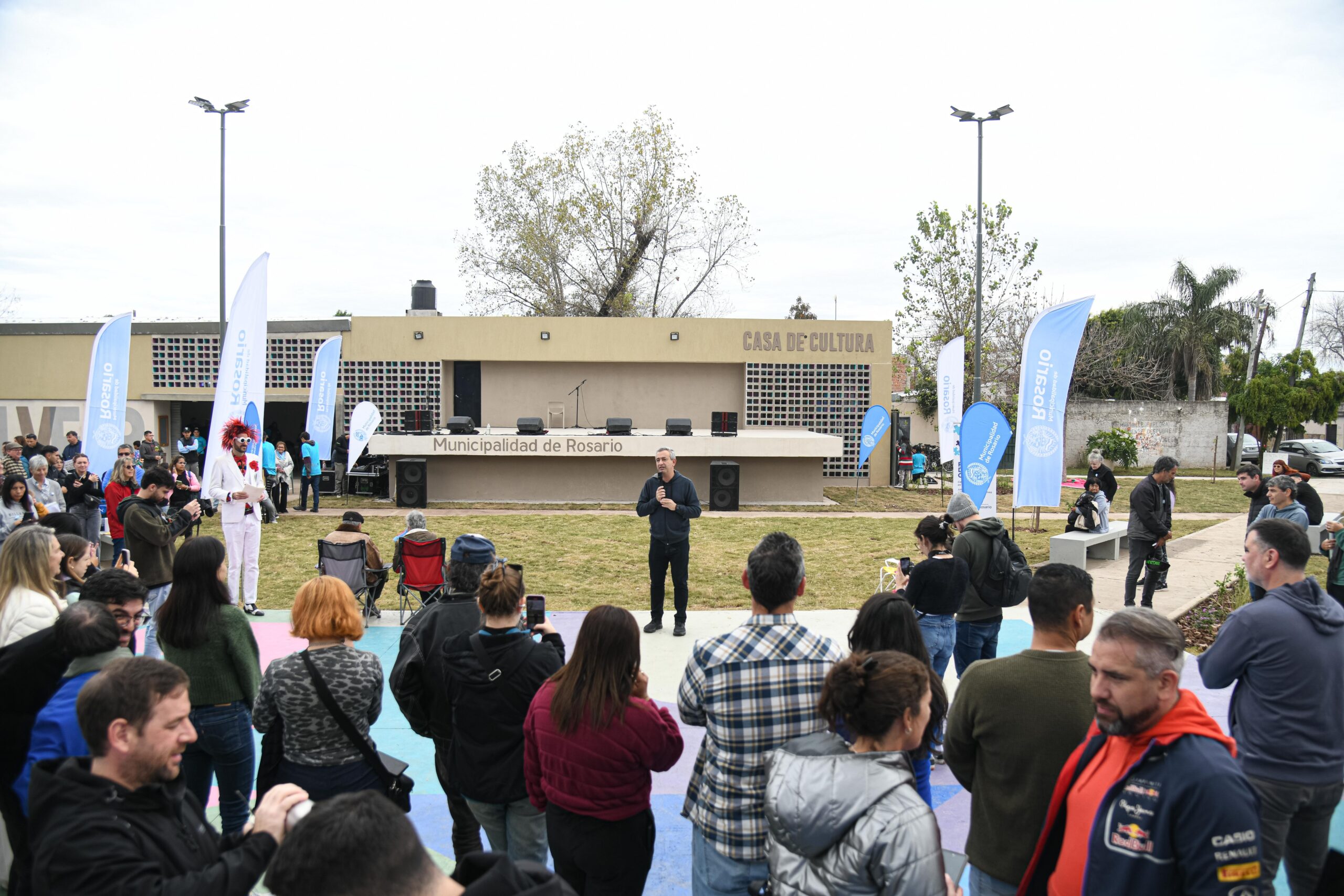 La multitudinaria celebración contó con la participación del intendente Pablo Javkin y la presencia de Clara, vecina del barrio y esposa de Lucio Pérez, quien hace tres décadas comenzó con el proyecto de un centro cultural en y para el barrio, y la de la coordinadora de la institución, Graciela Semorile.