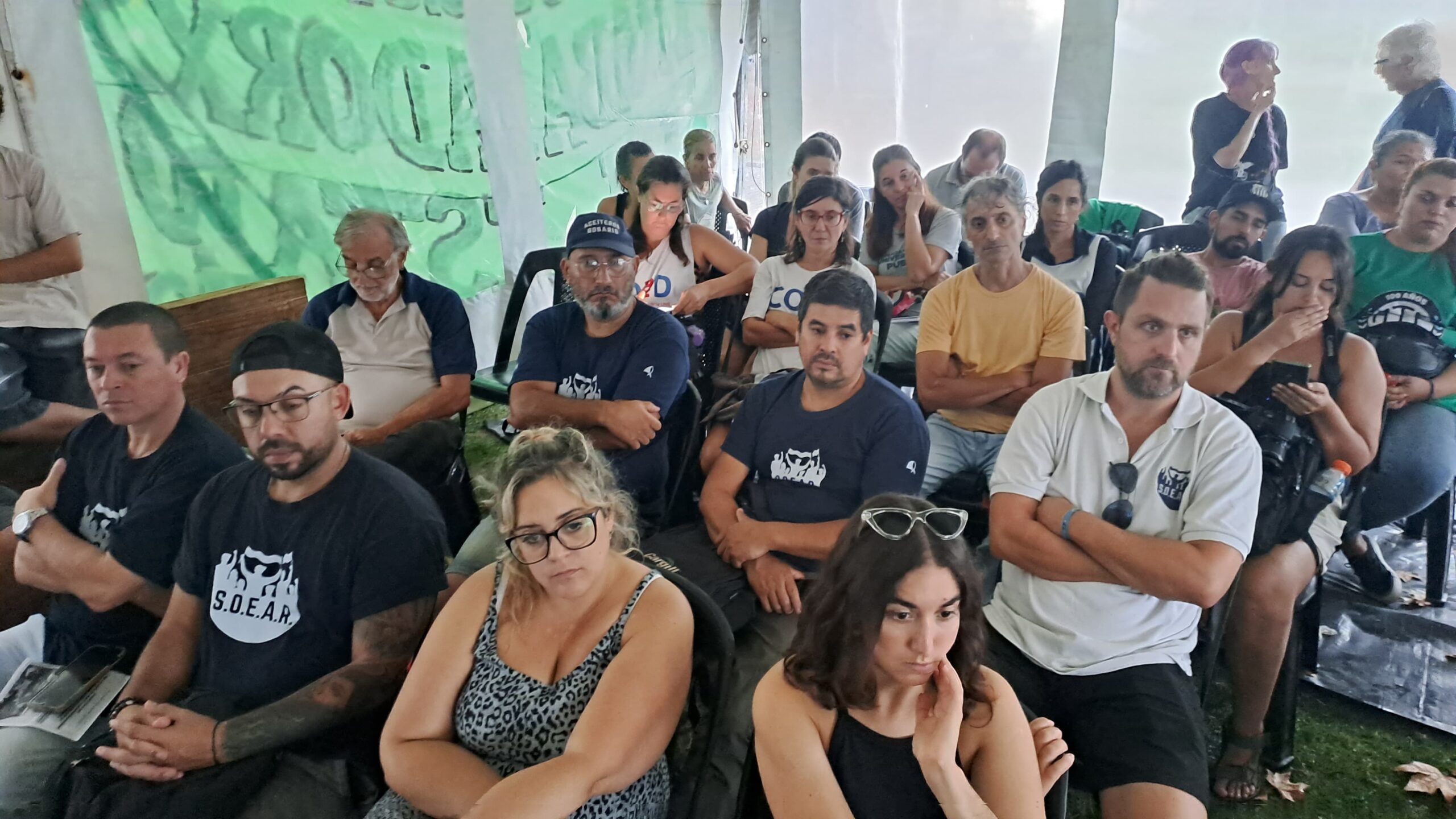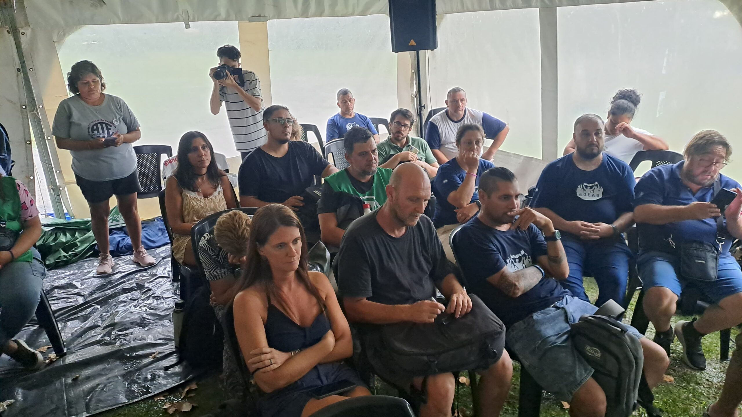 La instalación de la carpa comenzó al mediodía, antes de la tormenta que luego azotó a la ciudad, y se convirtió en un punto de encuentro para trabajadores de distintos ámbitos.
