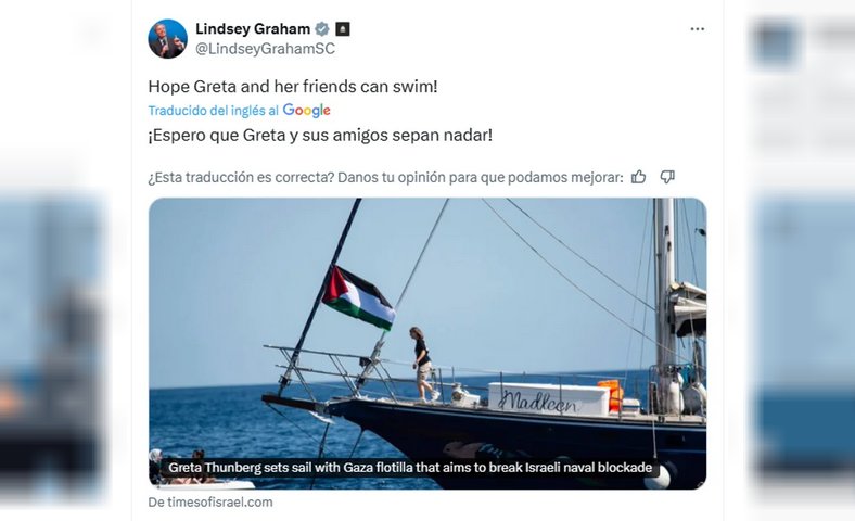 Ante esa iniciativa, un senador estadounidense, Lindsey Graham, deslizó un comentario en la red social X que generó polémicas. “Espero que Greta y sus amigos sepan nadar”, escribió el legislador en su cuenta de X, junto a una noticia sobre lapresencia de Thunberg en la flotilla.