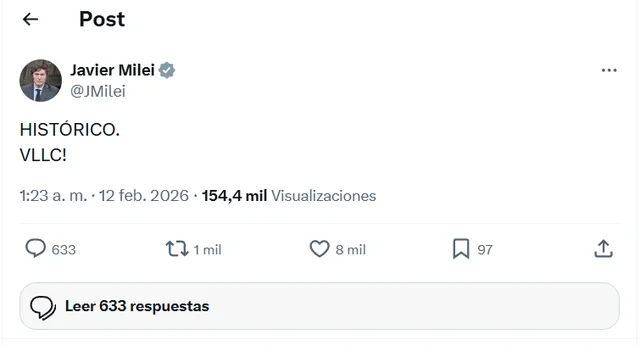 “Histórico. VLLC», publicó el mandatario nacional en su cuenta de X.