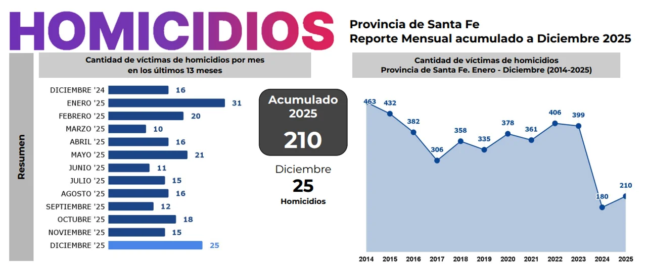 Uno de los datos que más se esperaba en el cierre de 2025 era conocer cuál había sido la situación en torno a la seguridad en Santa Fe. El último informe dado a conocer por el OSP indica que el año pasado hubo 210 homicidios, 30 más con relación a 2024. Dicho año fue uno de los más impactantes en torno a la cifra, debido a que en 2023 se registraron cerca de 400 crímenes, pero la implementación del Plan Bandera permitió que ese número se reduzca de manera significativa.