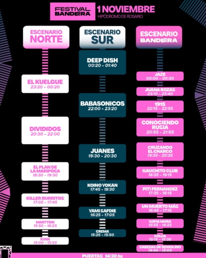 La sexta edición del Festival Bandera ya tiene todo listo. Este sábado 1 de noviembre, el Hipódromo de Rosario, en pleno Parque de la Independencia, volverá a convertirse en el epicentro de la música nacional e internacional con más de once horas de shows en vivo, tres escenarios y una grilla de 20 artistas.