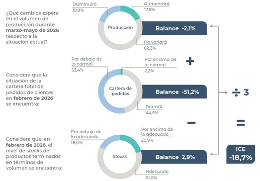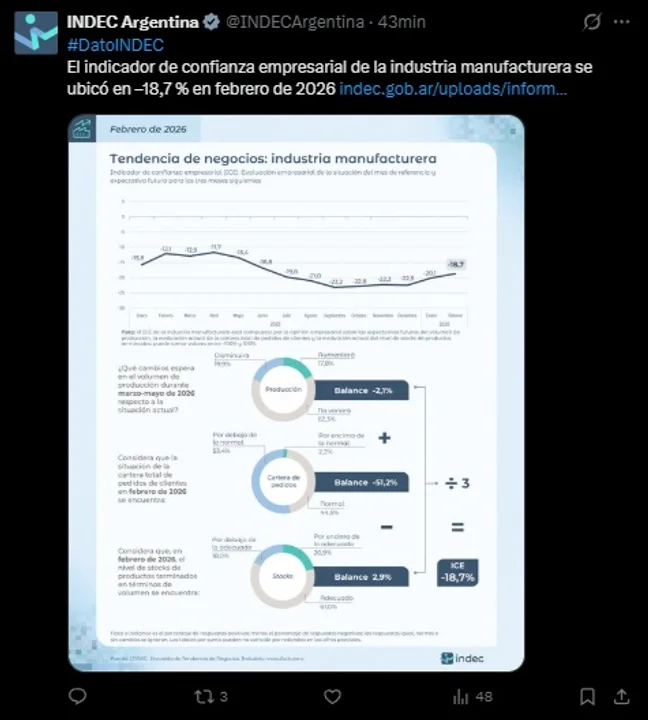 Al respecto informa que “el indicador de confianza empresarial de la industria manufacturera se ubicó en -18,7% en febrero de 2026” y explica cómo se formó el número.