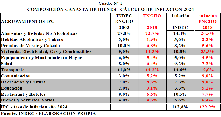 La medición del Índice de Precios al Consumidor (IPC), base para obtener la tasa de inflación, depende de dos factores claves: a) Una correcta información de precios, B) Una fiel representatividad de la canasta de gastos. A partir de los cambios introducidos por INDEC en 2016, las encuestas de precios se normalizaron y hubo algunos ajustes en la composición de la canasta. Sin embargo, esta ultima continua sin reflejar la situación actual de gastos, a pesar de existir mediciones mas actualizadas. Paralelamente, la aplicación de aumentos tarifarios y eliminación de subsidios a los servicios implementados por el gobierno de la LLA en 2024, variaron sustancialmente la relación de precios entre servicios y el resto de los bienes, situación que no se ve reflejada en la tasa de inflación, determinando una subvaluación de la misma.