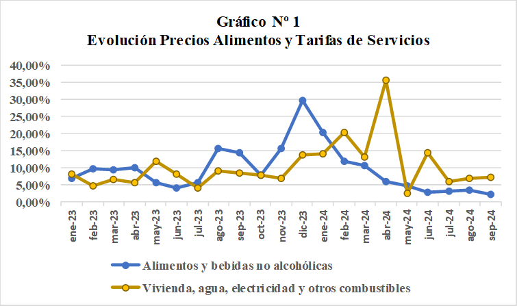 Es decir, la aplicación de una composición del gasto de las familias mas actualizada, como lo es la ENGHo 2018, en donde además se miden cuadros tarifarios con reducción de subsidios, más compatibles con los actuales, nos lleva a un sesgo para el IPC mayor en 13 puntos porcentuales. Este podría considerarse como mínimo, ya que como fue señalado los ajustes tarifarios en el 2024 fueron muy superiores a los observados en el gobierno de JxC. En el Gráfico Nº 1 puede observase, la evolución de los precios de los alimentos y de las tarifas de servicios (viviendas) desde 2022 hasta septiembre de 2024. El aumento de las tarifas supera a la variación del precio de los alimentos luego de la devaluación de diciembre de 2024. En oposición, la situación previa con el gobierno del Frente de Todos, mantuvo “pisadas” las tarifas, se muestra un mayor crecimiento en precios de los alimentos. Esas variaciones, modificaron sensiblemente el cuadro de precios relativos entre alimentos y tarifas, y en consecuencia la estructura de gasto de los hogares.