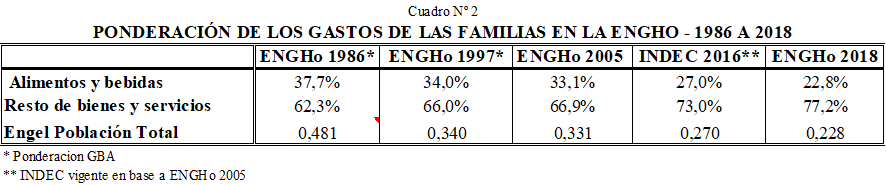 La medición estadística de la pobreza que realiza el INDEC trimestralmente, depende de la aplicación del coeficiente de Engel, el que se obtiene en base a la estructura de gastos de los hogares medido por la ENGHo. Las mediciones de pobreza actuales se basan en una ENGHO realizada entre 2004 y 2005, es decir con 20 años de antigüedad, en el marco de una estructura de consumo cambiante por el avance tecnológico y también por las oscilaciones registrada entre precios de bienes y servicios, debido a las diferentes políticas de subsidios que siguieron los gobiernos desde 2005. El Engel refleja el porcentaje de gastos de alimentos de los hogares y se aplica en forma inversa, por lo cual cuando disminuye el porcentaje de gastos en alimentos aumenta el coeficiente y también la estadística de pobreza. Nótese que en 2005 el porcentaje de gasto en alimento en los hogares era el 33.1% y en 2018 (última encuesta ENGHo realizada y no utilizada) ese porcentaje disminuyó a 22.8%, Claramente, la estadística de pobreza estaría subvaluada sin continuamos con los datos de 2005.
