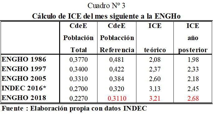 - Para 2018, se consideró la relación INDEC 2016, suponiendo que se mantiene la misma relación. Con esto se calculó un ICE teórico y el correspondiente al año 2019, año posterior (Ver Cuadro Nº 3). El resultado es de 2.68, que se obtiene con los siguientes pasos: 1) relación INDEC 2016 (0.8=2.45/3.13); 2) CdeE de población de referencia es el gasto en alimentos del segundo quintil del INDEC2016; 0.3110; 3) El ICE teórico 2018 es 1/0.3110= 3.21; 4) El ICE año posterior es 0.8 x ICE teórico = 2.68.