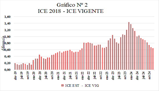 - A fin de mostrar el sesgo existente por no aplicar la ENGHO2018 para el cálculo de ICE, en el Grafico Nº 2 se presentan las diferencias entre el ICE estimado con la ENGHO 2018 y el ICE vigente, a partir de abril de 2016 (fecha de la reedición de los índices del INDEC.