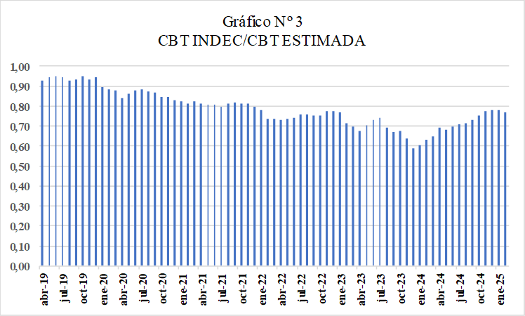 Estos sesgos deberían ampliar la CBT a partir de una expansión mayor de la CBA, elevando la Línea de Pobreza (se reitera para medir la estadística de pobreza debemos comparar con los ingresos de las familias). Siguiendo el mismo formato, en el Gráfico Nº 3 se puede observar el sesgo estimado en la medición de la CBT bajo el formato de CBT INDEC/CBT estimada.