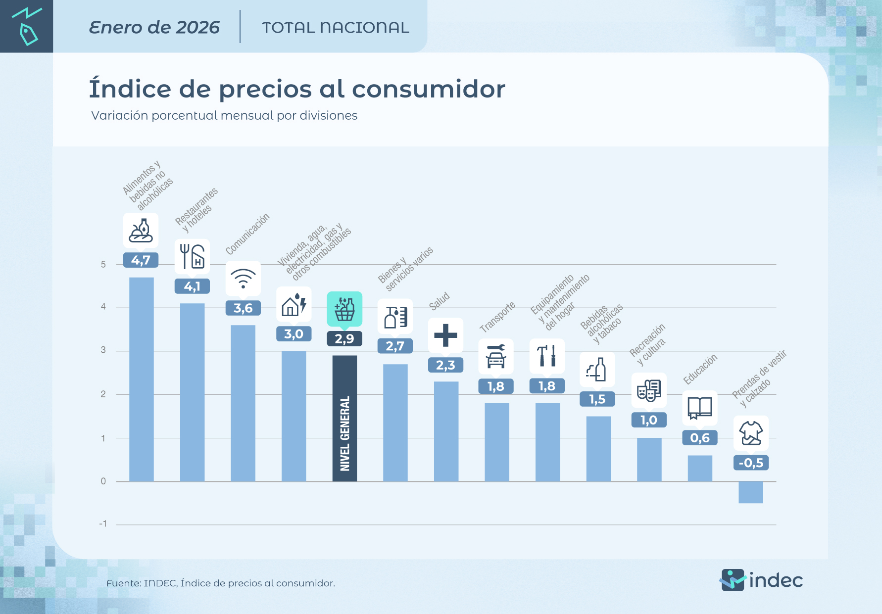 Tras el índice de inflación de enero del 2,9, los rubros que más subieron fueron Alimentos y bebidas no alcohólicas (4,7%) y Restaurantes y hoteles (4,1%).