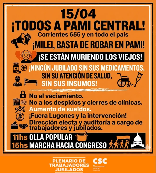 “Milei, basta de robar en PAMI. ¡Se están muriendo los viejos! No puede haber un jubilado más sin sus medicamentos, sin su atención en Salud ni sin sus insumos. Rechazamos el vaciamiento del organismo, los despidos masivos y los cierres de las clínicas y exigimos el aumento de haberes”, manifestaron a través del documento que difundieron este mediodía.