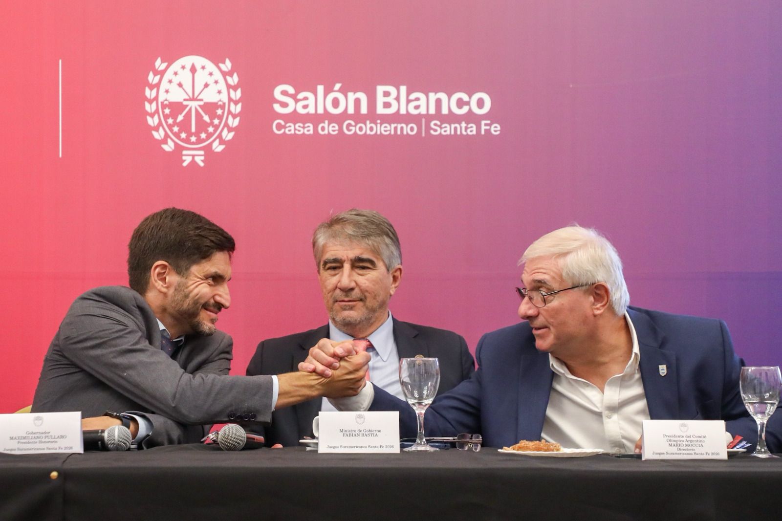 El gobernador Maximiliano Pullaro encabezó este viernes la primera reunión del Comité Organizador Local (COL) de los Juegos de la Organización Deportiva Suramericana (Odesur), que se desarrollarán del 12 al 26 de septiembre de 2026 y tendrán como sedes a las ciudades de Santa Fe, Rosario y Rafaela, donde se competirá en más de 50 disciplinas, 26 de las cuales serán clasificatorias a los Juegos Panamericanos 2027.