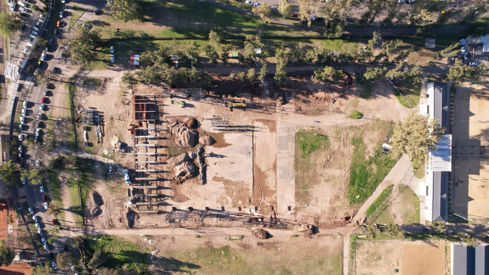 Sobre estos avances, el subsecretario de Arquitectura y Obras Públicas, Lucas Condal, señaló que “también avanzamos en la ejecución de columnas, vigas de hormigón y conductos pluviales principales en el bloque de servicios, donde estarán los vestuarios y baños”.