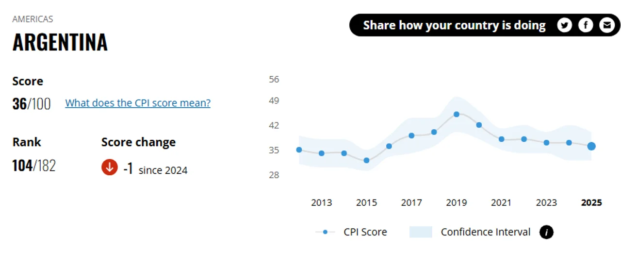 Es un punto menor a la puntuación obtenida en 2024, por lo cual Argentina se percibiría como un país más corrupto.
