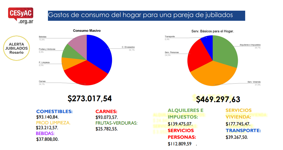 Del total, $273.017 correspondieron a productos de consumo masivo, mientras que $469.297 se destinaron al pago de servicios del hogar. Nicolás Parisi, referente del Cesyac Rosario, advirtió que “lo que más está afectando al bolsillo de los jubilados son los medicamentos, teniendo en cuenta que los precios tienden a subir y los subsidios a bajar”.