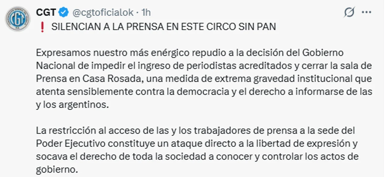 “La restricción al acceso de las y los trabajadores de prensa a la sede del Poder Ejecutivo constituye un ataque directo a la libertad de expresión y socava el derecho de toda la sociedad a conocer y controlar los actos de Gobierno. Prácticas de este calibre no han sido puestas en marcha ni en los años más oscuros de la dictadura militar y configuran un retroceso preocupante”, indicó la central obrera comandada por Octavio Argüello, Jorge Sola y Cristian Jerónimo.