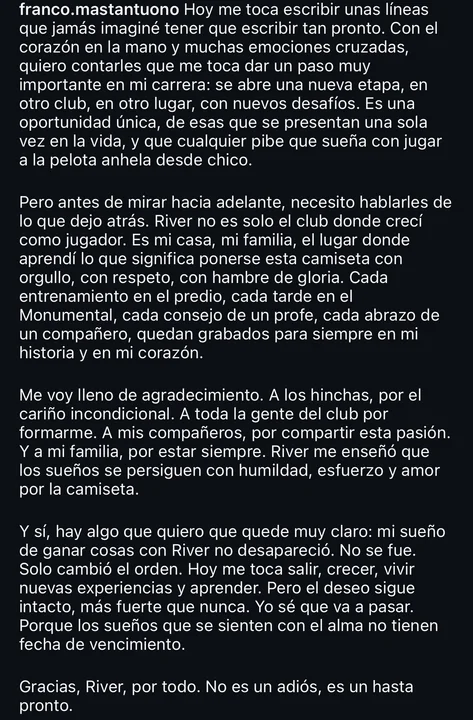 “Pero antes de mirar hacia adelante, necesito hablarles de lo que dejo atrás. River no es solo el club donde crecí como jugador. Es mi casa, mi familia, el lugar donde aprendí lo que significa ponerse esta camiseta con orgullo, con respeto, con hambre de gloria. Cada entrenamiento en el predio, cada tarde en el Monumental, cada consejo de un profe, cada abrazo de un compañero, quedan grabados para siempre en mi historia y en mi corazón” agregó.