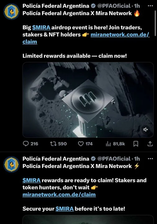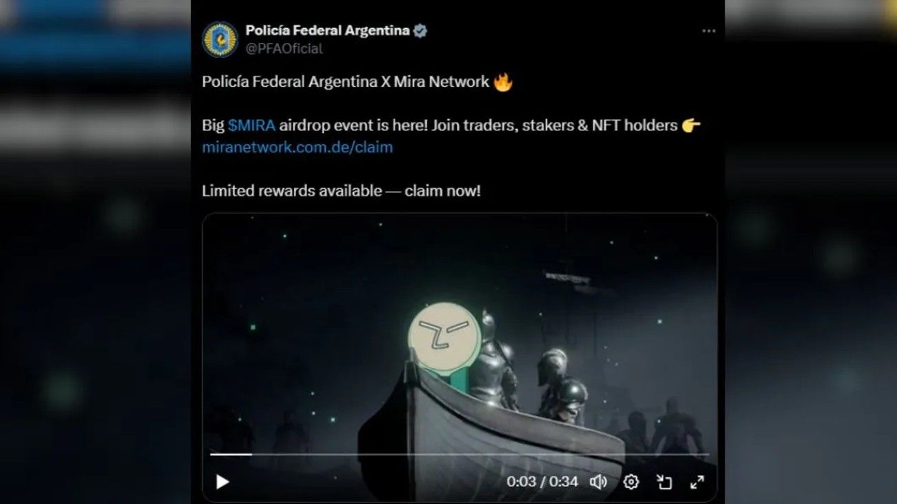 Las publicaciones mencionan: “Policía Federal Argentina Х Mira Network, Big $MIRA airdrop event is here! Join traders, stakers & NFT holders. Limited rewards available — claim now!”. Según se pudo ver se trataba de una criptomoneda con el nombre de $MIRA.