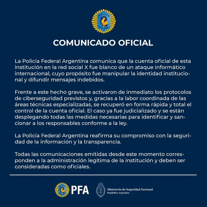 El comunicado de La Policía Federal Argentina comunica que la cuenta oficial de esta institución de la red social X fue blanco de un ataque informático internacional cuyo propósito fue manipular la identidad institucional y difundor mensajes indebidos.