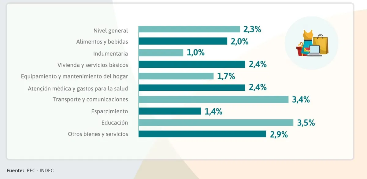 El informe del IPEC detalla que los mayores aumentos se registraron en los rubros “Educación” (+3,5%) y “Transporte y telecomunicaciones” (+3,4%). En tanto, “Alimentos y bebidas no alcohólicas”, el rubro de mayor peso en la canasta familiar, subió un 2%, ubicándose por debajo del promedio general.