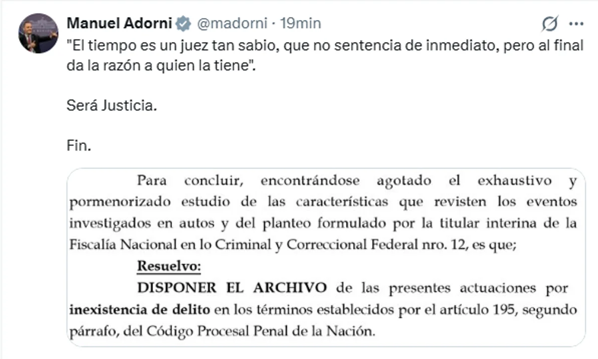 Adorni celebró en redes sociales el archivo de la causa que investigaba el viaje de su esposa a Estados Unidos en el avión presidencial: “El tiempo es un juez tan sabio, que no sentencia de inmediato, pero al final da la razón a quien la tiene. Será Justicia. Fin”, escribió, en un mensaje que rápidamente generó repercusiones.