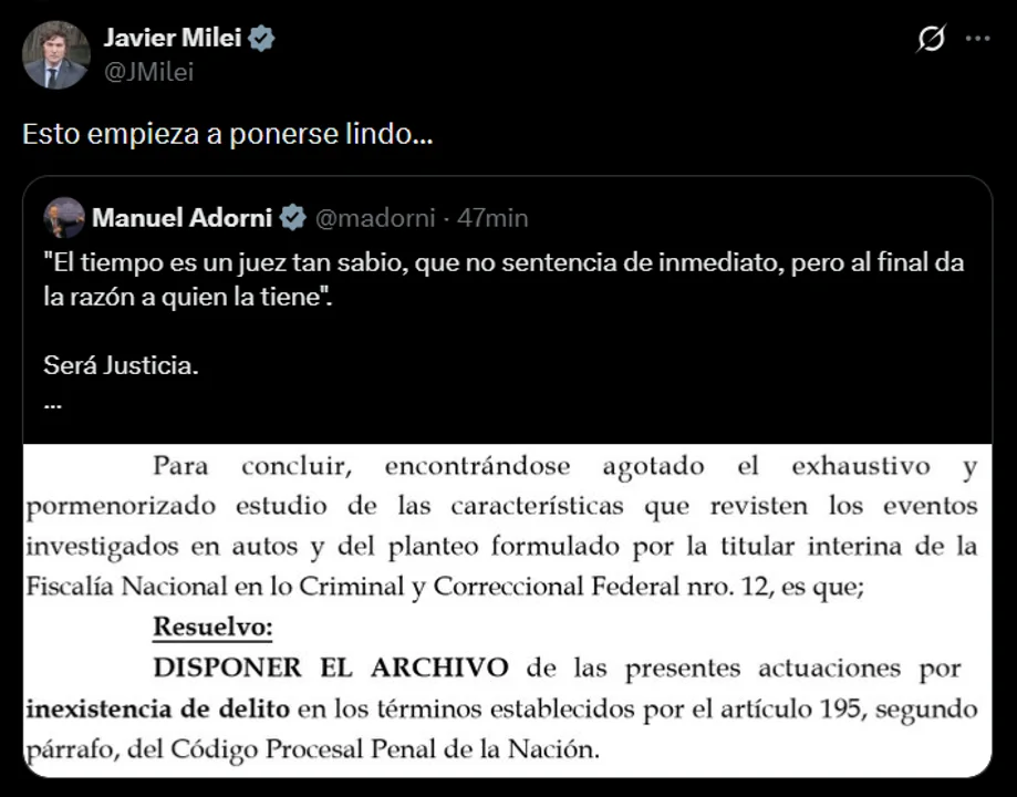 Javier Milei también se hizo eco de la noticia: expresó en X que “esto se empieza a poner lindo”.
