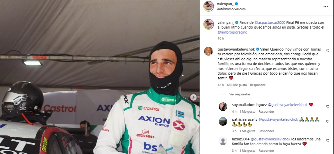 Su abuelo le dedicó un mensaje y contó cómo atraviesan este momento: “Valen Querido, hoy vimos con Tomas tu carrera por televisión, nos emocionó, nos enorgulleció que estuvieses ahí de alguna manera representando a nuestra familia, es una forma de decirles a todos los que nos quieren y nos hicieron llegar su afecto, que estamos tristes, con mucho dolor, pero de pie. Gracias por todo el cariño que nos hacen sentir”.