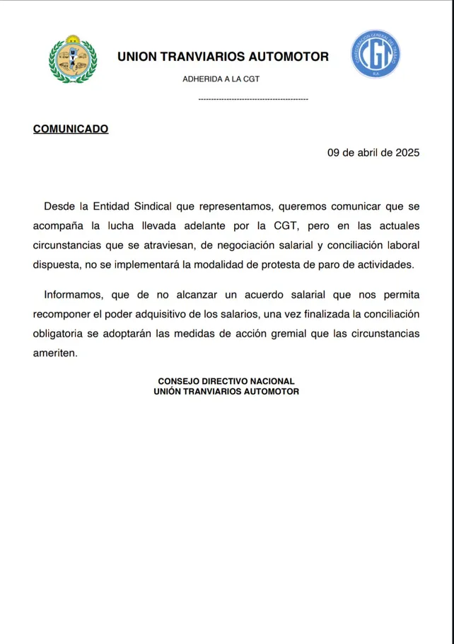 A nivel nacional, la UTA había mantenido una postura ambigua frente al paro, generando incertidumbre sobre su participación. En este caso, el gremio de los choferes decidió no adherir a la medida de fuerza debido a que se encuentra en medio de una conciliación obligatoria en el Área Metropolitana de Buenos Aires (AMBA), que tiene vigencia por 15 días. Aunque la CGT insistió en que la conciliación no impedía la adhesión al paro, el gremio de choferes no emitió un comunicado oficial al respecto.