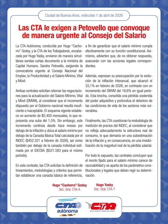 Las dos CTA (Trabajadores y Autónoma) conducidas por Hugo Yasky (CTA-T) y Hugo Godoy (CTA-A) respectivamente, enviaron una carta documento a la ministra de Capital Humano, Sandra Pettovello, con el objetivo de convocar “de manera urgente” al Consejo Nacional del Empleo, la Productividad y el Salario Mínimo, Vital y Móvil.