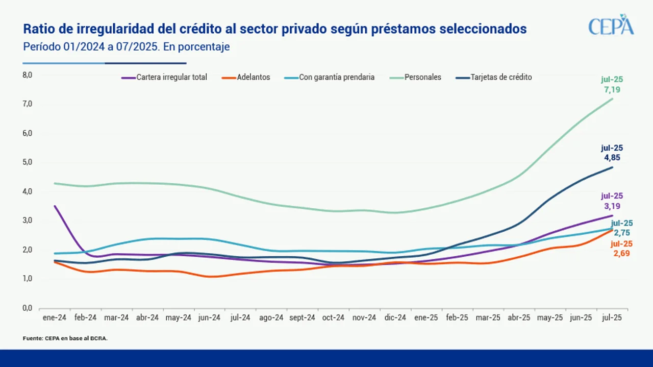 - Préstamos personales: el porcentaje de irregularidad pasó de 3,28% en diciembre de 2024 a 7,19% en julio de 2025.
