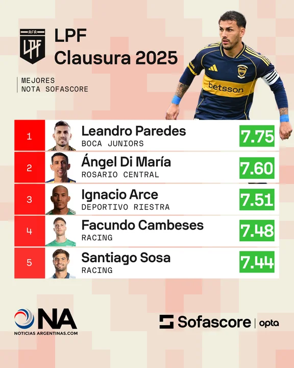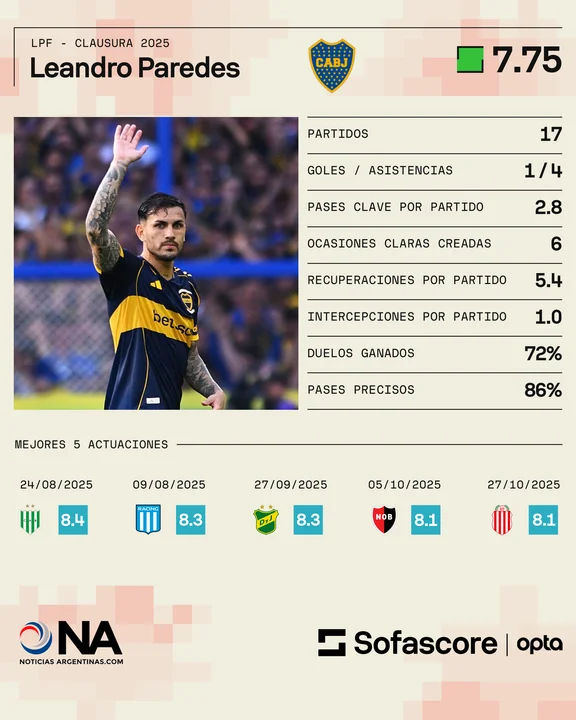 En ese marco se conoció que la distinción fue otorgada por Sofascore, la plataforma especializada en análisis de desempeño, que entrega el Sofascore Player of the Season del Torneo Clausura 2025. Paredes quedó como el jugador con mejor calificación del fútbol argentino, por delante de Ángel Di María, Ignacio Arce, Facundo Cambeses y Santiago Sosa.
