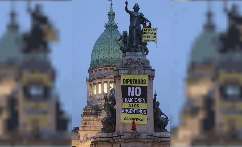 Un activista se trepó a un monumento situado en el Congreso de la Nación para colocar dos banderas a modo de protesta en rechazo a la reforma a la Ley de Glaciares.