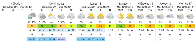 Hacia el martes 14 y miércoles 15, el cielo permanecerá parcialmente nublado, con mínimas de 14° y 17°, y máximas que treparán hasta los 28°.