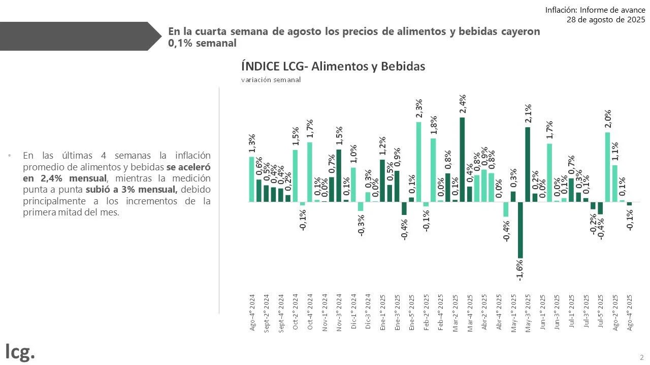 En tanto, para EcoGo la inflación en alimentos consumidos dentro del hogar ascendería a 2,3% en agosto. Incorporando los aumentos registrados en alimentos consumidos fuera del hogar (3,2%), el indicador se ubica en 2,5%.