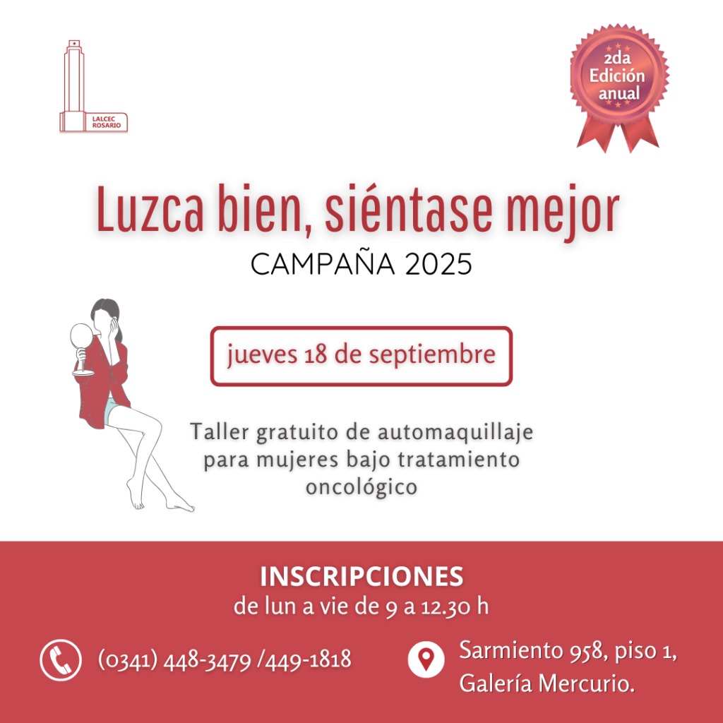 La Liga argentina de lucha contra el Cáncer (Lalcec) de Rosario abre las puertas de su sede para realizar la segunda edición anual, junto a la Cámara Argentina de la Industria de Perfumería y Cosmética (CAPA), del taller de automaquillaje y uso de accesorios destinado a mujeres bajo tratamiento oncológico que aún no hayan asistido a estas reuniones. La cita es este jueves en Sarmiento 958, Galería Mercurio, piso 1.