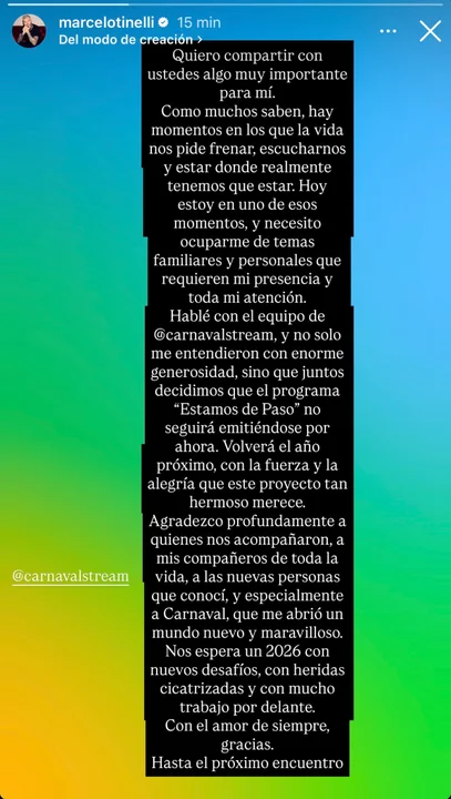“Hoy estoy en uno de esos momentos, y necesito ocuparme de temas familiares y personales que requieren mi presencia y toda mi atención. Hablé con el equipo de Carnaval Stream y no solo me entendieron, sino que juntos decidimos que el programa ‘Estamos de Paso’ no seguirá emitiéndose por ahora”, continuó.