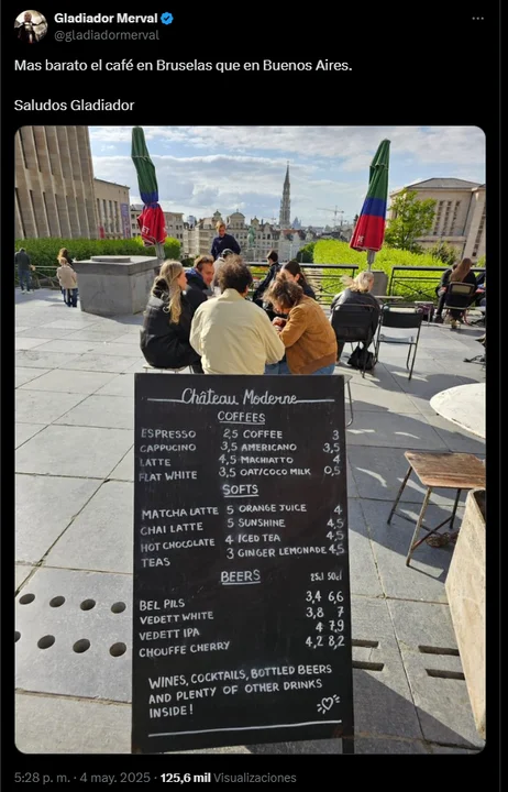 “Más barato el café en Bruselas que en Buenos Aires”, escribió el influencer financiero al publicar la imagen de una pizarra del bar Château Moderne, en Bélgica, donde un espresso cuesta 2,5 euros y un capuccino 3,5. La comparación con una boleta de consumo en el clásico bar porteño “La Ideal”, donde un capuccino italiano costó $14.500 (USD 12,35 al cambio MEP de entonces), desató críticas.