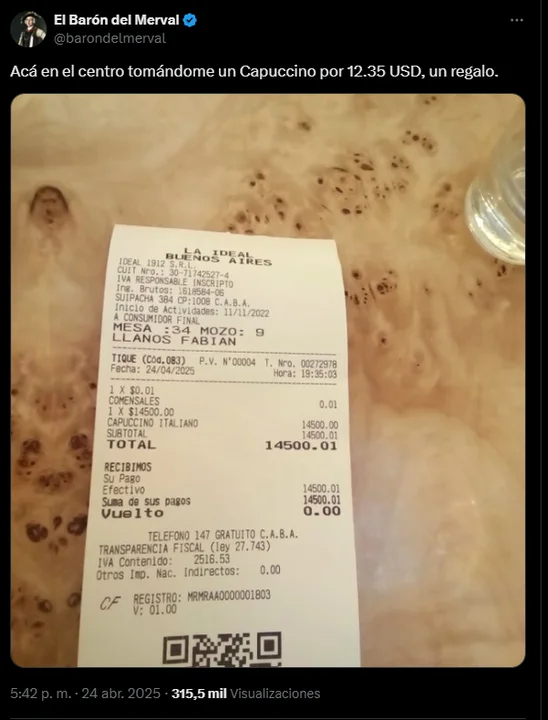 En otro tuit, “El Barón del Merval” ironizó: “Acá en el centro tomándome un capuccino por 12.35 USD, un regalo”, en alusión al contraste con ciudades europeas.