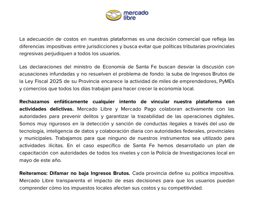 La empresa fundada por Marcos Galperin sostuvo que el cobro de Ingresos Brutos en la provincia santafesina «encarece la actividad de miles de emprendedores, PyMEs (Pequeñas y Medianas Empresas) y comercios, que todos los días trabajan para hacer crecer la economía local».